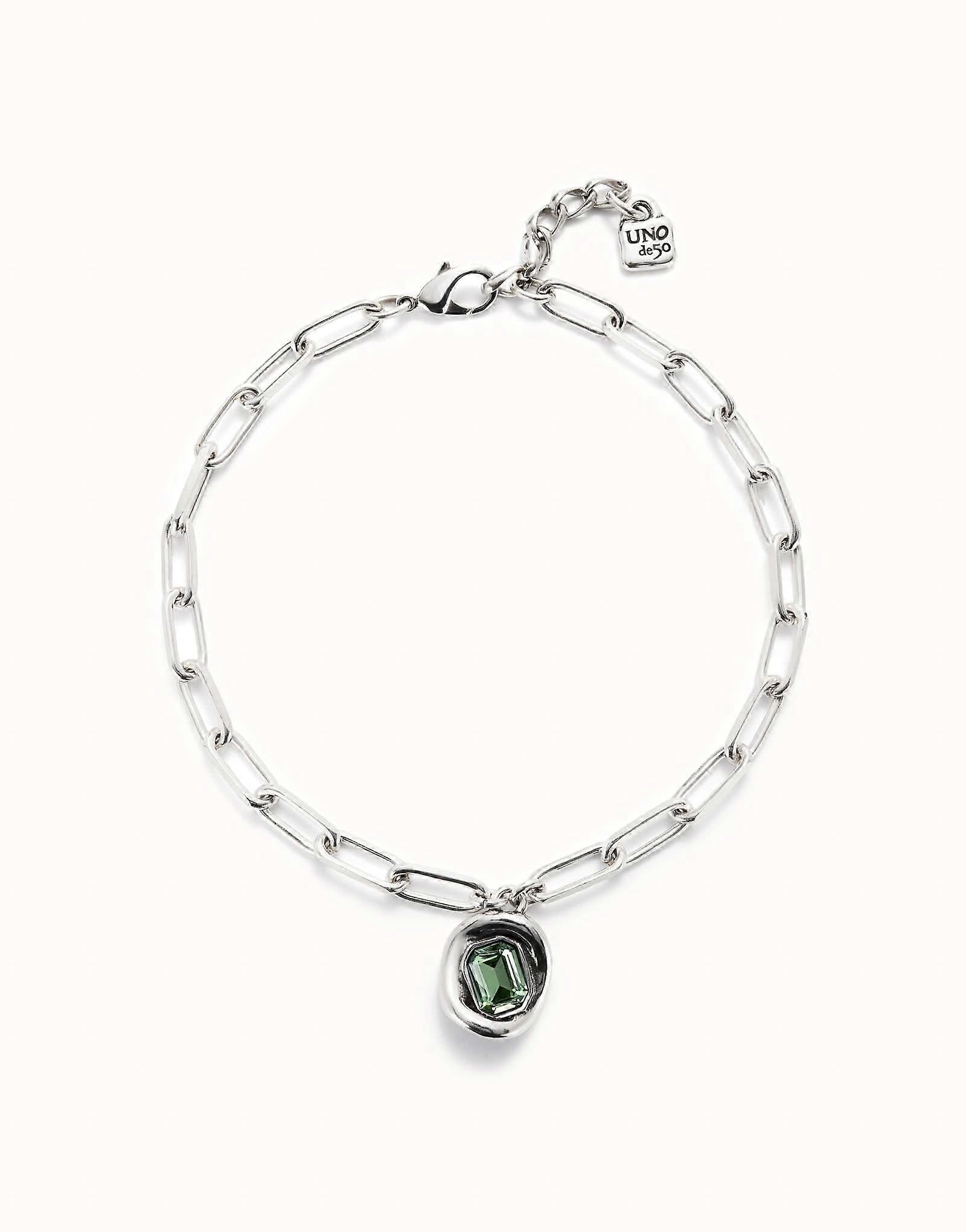 Sterling silver-plated chain with links and a central faceted green crystal piece. Made in Spain with a 100% handmade process. Now is the time to trust your instincts and choose jewelry that you always wanted but never dared to wear. Choose links if you dare to go further. Discover the collection ser valiente.