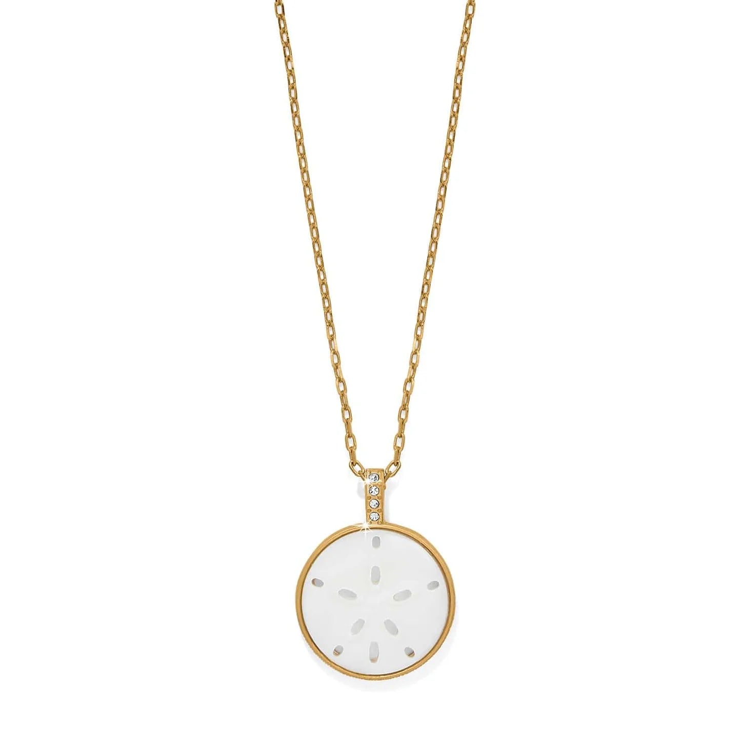 A sand dollar medallion of genuine mother of pearl shell is custom-cut and hand-carved by dedicated artisans and framed in gold to add beauty and a beachy touch to this petite pendant necklace
